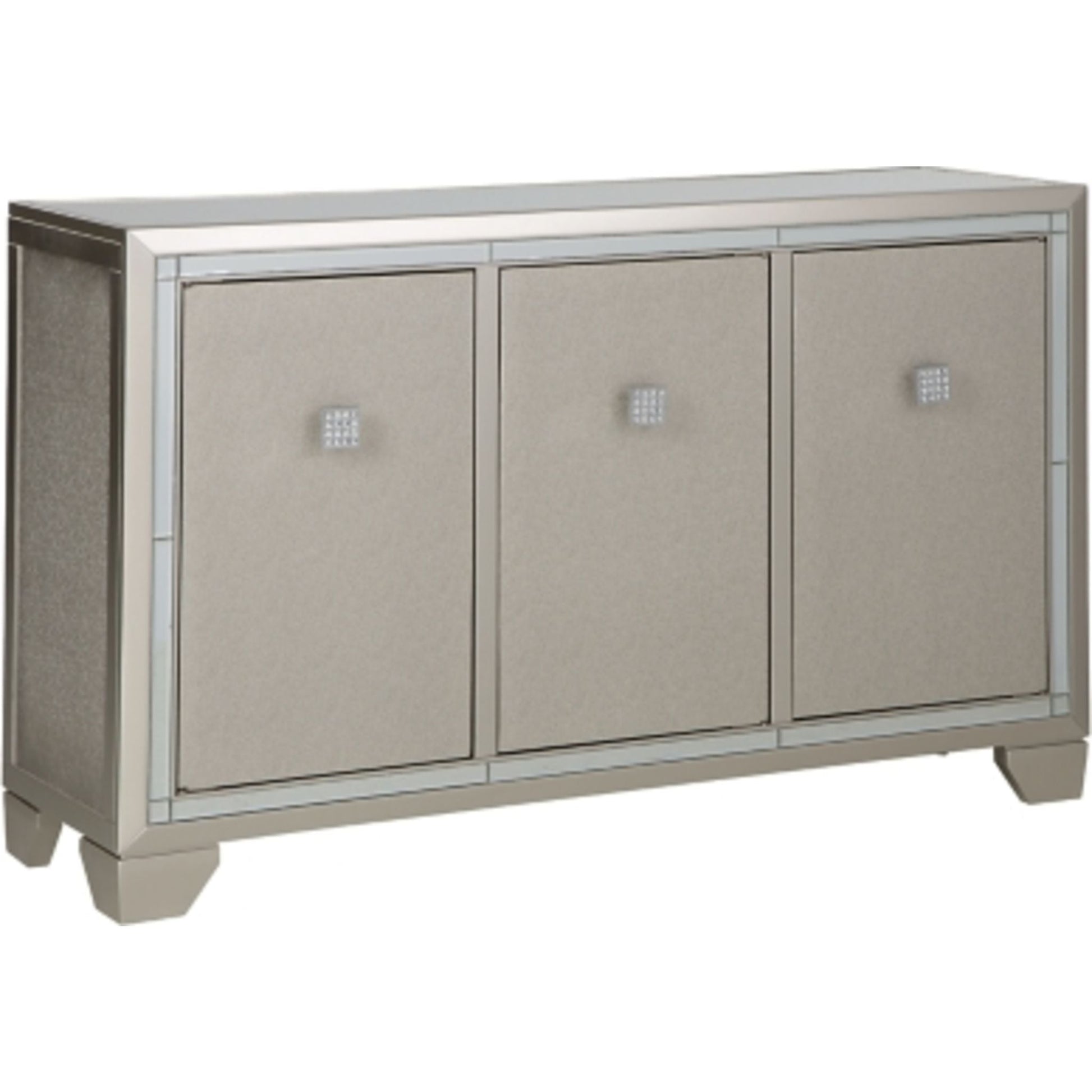 Reflect your love for contemporary style with this accent cabinet. It features a mirrored top and beveled mirror accents, adding both light and a touch of glam to your space. Decorated with faux crystal and chrome-tone pulls, the textured silvertone door fronts open to reveal adjustable shelving to meet all your storage needs.