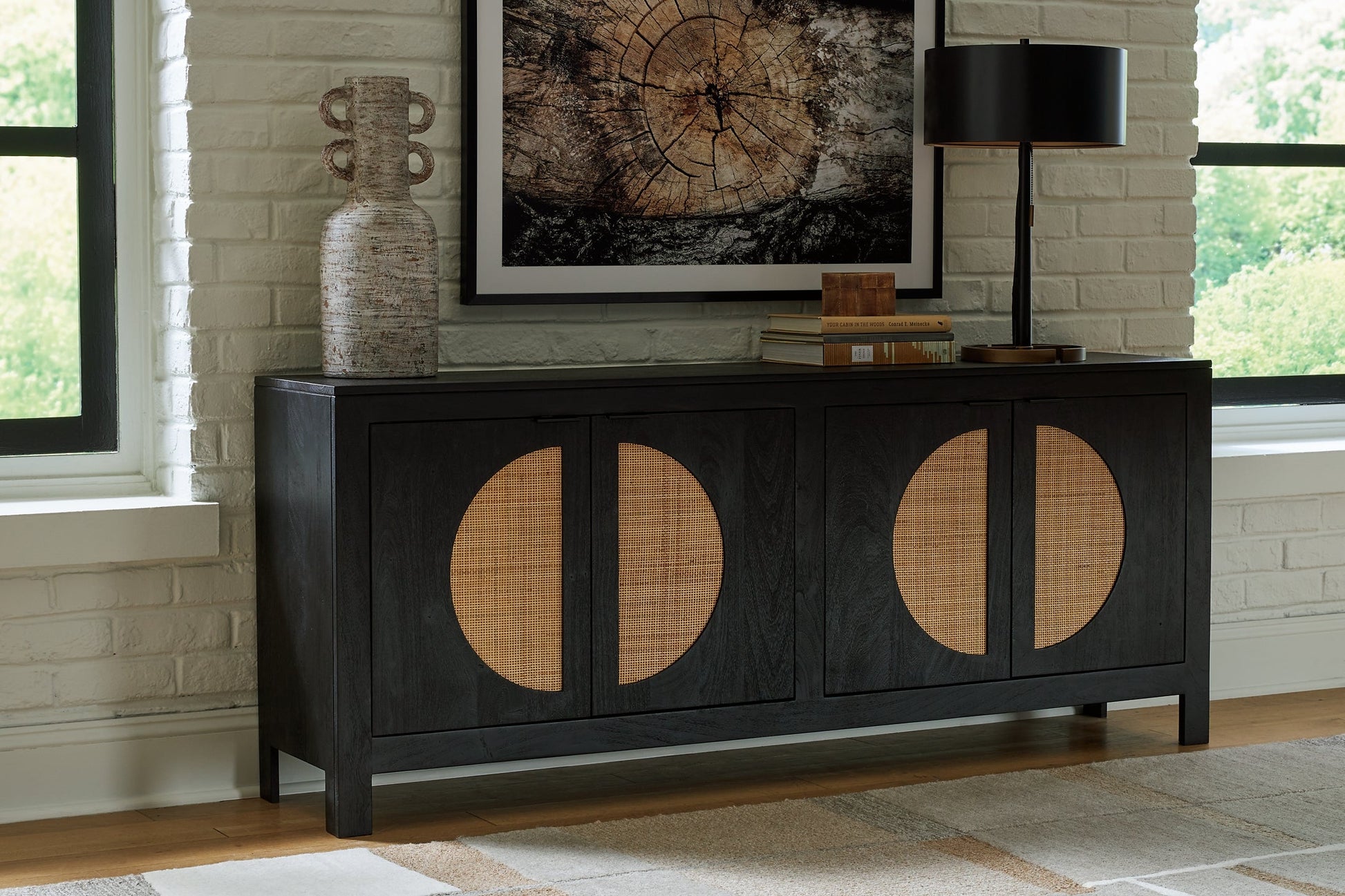 Bring high style and functionality to your home with this contemporary accent cabinet. Woven cane door fronts and a contrasting black finish bring the wow factor to this mid-century inspired piece. Whether it suits your storage needs in the dining room, home office or entryway, it's quite a showpiece.